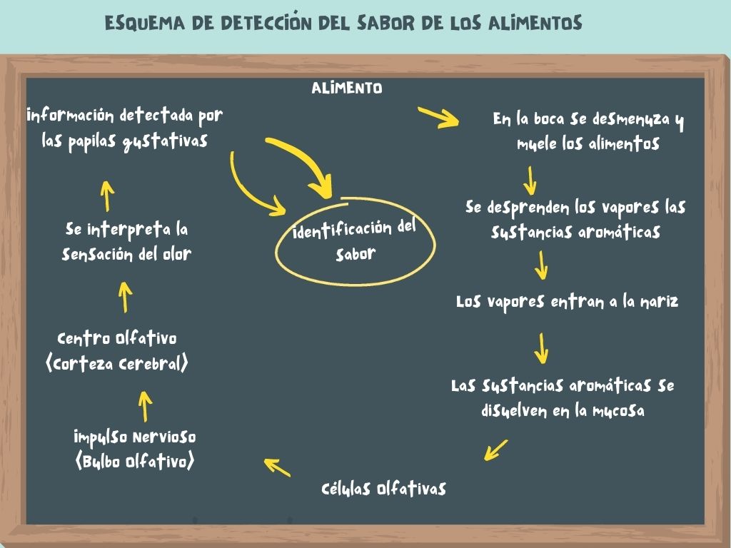 Cuando se junta las dos informaciones del sentido del gusto mas el sentido del olfato el cerebro junta ambas informaciones y revisa en sus recuerdos para ver si conocemos este sabor. Caso no lo reconozca el sabor se crea nuevo recuerdo en su banco de datos.
